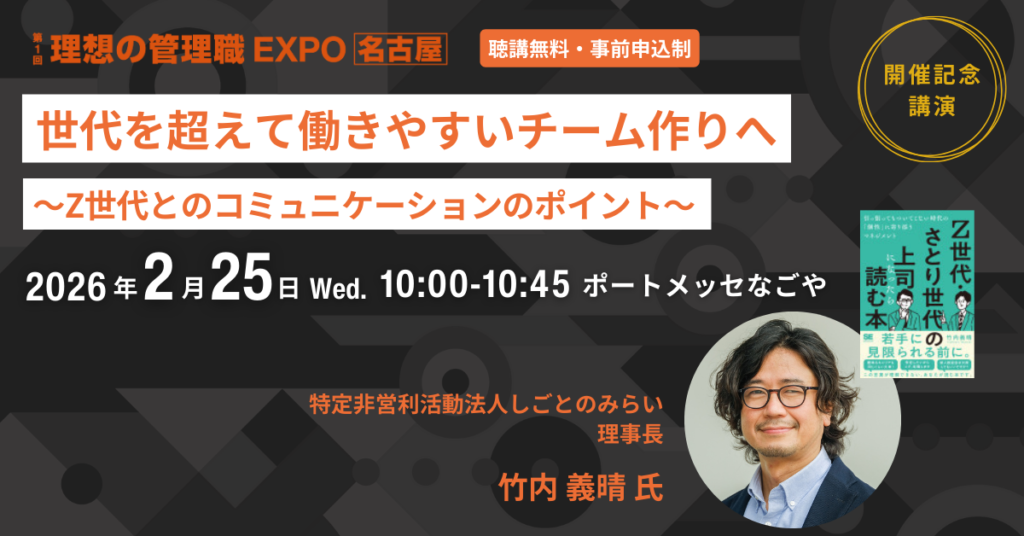 2026年2月25日(水)〜27日(金)に「ポートメッセなごや」で開催される「総務・人事・経理Week 理想の管理職EXPO名古屋」にて、「管理職向け」の開催記念講演に登壇いたします。